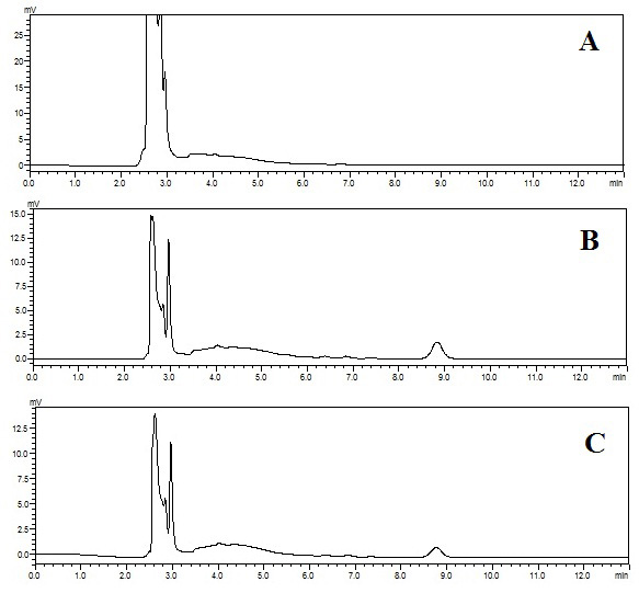 Fig. 7: Representative chromatogram of blank rat plasma(A), Typical chromatogram obtained after oral administration of MTX FDT (B) and MTX solution (C) showing well resolved peak of MTX.