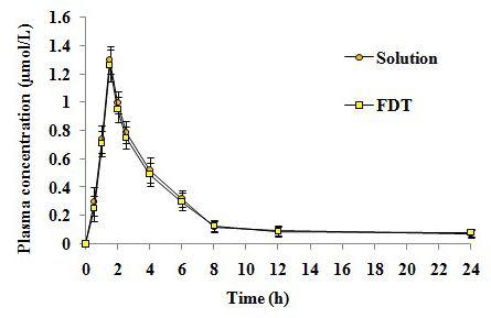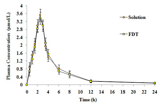 Fig. 8: Plasma concentration time profile of MTX after oral administration of F1 FDT and MTX Solution. Data represent the mean ± S. D. (n = 6).