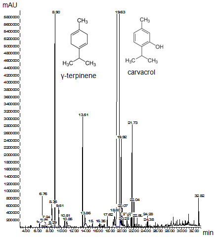 The second quantitative component of essential oil is γ-terpinene which is used in cosmetics and food industries as flavoring chemical. The other components (β-caryophyllene, β-bisabolen etc.) have neuroprotective, antinociceptive and anti-inflammatory properties [9, 19-23].