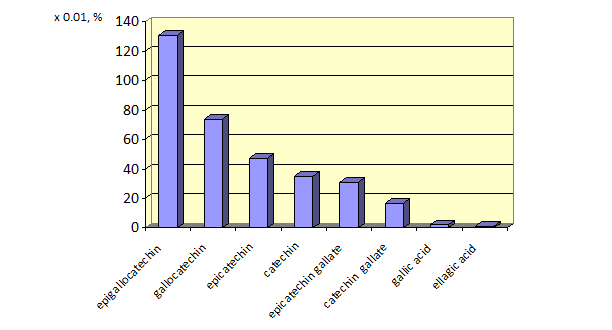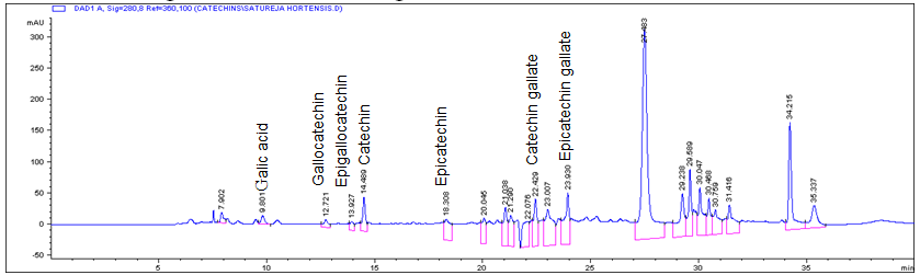 By HPLC it was identified a number of tannin components (fig. 2, 3). The presence of such compounds as epigallocatechin (130.91х10-2%), gallocatechin (73.87х10-2%), epicatechin (47.22х10-2%), catechin (35.18х10-2%), epicatechin gallate (31.13х10-2%), catechin gallate (16.55х10-2%), gallic acid (2.17х10-2%), and ellagic acid (1.11х10-2%) was found out. Most of them were detected in S. hortensis for the first time.