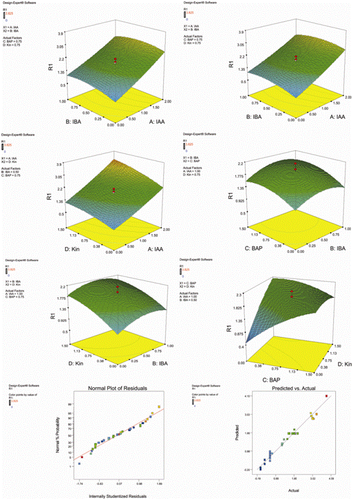 Response Surface Methodology (RSM) was used to investigate the main effects of variables on the growth of callus. IAA, IBA, BAP, KIN were selected as independent variables. Central composite design was used for the experimental data and data were fitted to a second order polynomial model and regression coefficients obtained. Mathematical models were evaluated, for each response by means of multiple regression analysis.