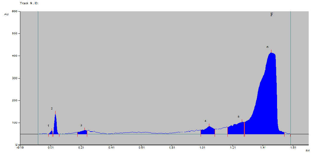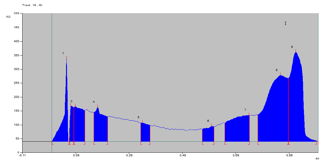 Fig. 2: HP-TLC curves for the quantification of TMA left unreacted to produce TMAO in (a) Normal control homogenate sample containing 0.1% TMA solution. (b) Normal control homogenate sample containing 0.2% TMA solution. (c) Normal control homogenate sample containing 0.3% TMA solution. (d) Normal control homogenate sample containing 0.4% TMA solution. (e) Normal control homogenate sample containing 0.5% TMA solution. (f) Pathogenic control homogenate sample containing 0.1% TMA solution. (g) Pathogenic control homogenate sample containing 0.2% TMA solution. (h) Pathogenic control homogenate sample containing 0.3% TMA solution. (i) Pathogenic control homogenate sample containing 0.4% TMA solution. (j) Curcumin-treated group homogenate sample containing 0.1% TMA solution. (k) Curcumin-treated group homogenate sample containing 0.2% TMA solution. (l) Curcumin-treated group homogenate sample containing 0.3% TMA solution. (m) Curcumin-treated group homogenate sample containing 0.4% TMA solution. (n) Curcumin-treated group homogenate sample containing 0.5% TMA solution. (o) Ciprofloxacin-treated group homogenate sample containing 0.1% TMA solution. (p) Ciprofloxacin-treated group homogenate sample containing 0.2% TMA solution (q) Ciprofloxacin-treated group homogenate sample containing 0.3% TMA solution. (r) Ciprofloxacin-treated group homogenate sample containing 0.4% TMA solution at 254 nm and Rf 0.73-0.79
