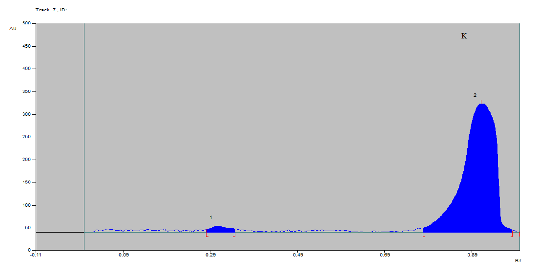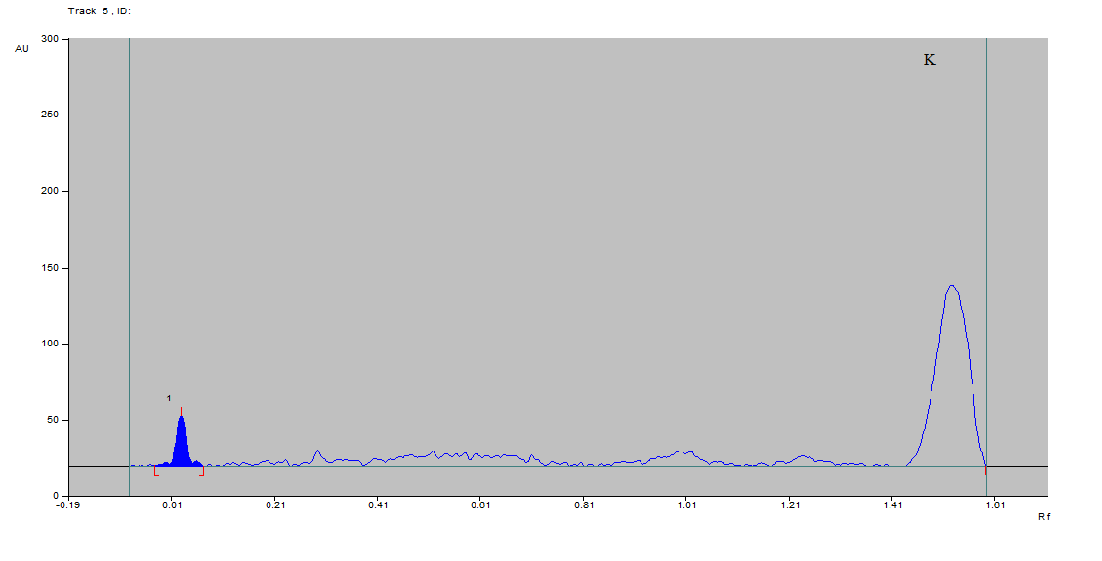 Fig. 1: HP-TLC curves for quantification of TMA conversion from standard choline (0.25 mg) in vitro at 254 nm and Rf 0.71-0.82(a) In nutrient broth. (b) In nutrient broth inoculated with Providencia rettgeri. (c) In nutrient broth inoculated with Providencia rettgeri containing choline. (d) In nutrient broth inoculated with Providencia rettgeri, choline and curcumin (1µg/ml). (e) In nutrient broth inoculated with Providencia rettgeri, choline and curcumin (5µg/ml). (f) In nutrient broth inoculated with Providencia rettgeri, choline and curcumin (10µg/ml). (g) In nutrient broth inoculated with Providencia rettgeri, choline and curcumin (20µg/ml). (h) In nutrient broth inoculated with Providencia rettgeri, choline and ciprofloxacin (1 µg/ml). (i) In nutrient broth inoculated with Providencia rettgeri, choline and ciprofloxacin (5 µg/ml). (j) In nutrient broth inoculated with Providencia rettgeri, choline and ciprofloxacin (10 µg/ml). (k) In nutrient broth inoculated with Providencia rettgeri, choline and ciprofloxacin (20 µg/ml)