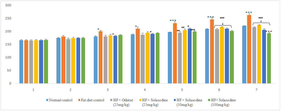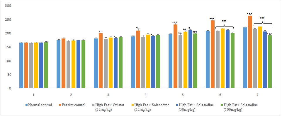 Consumption of HF produced a significantly increased in body weight as compared to the consumption of normal diet (normal control group) after 1 w of treatment and continued up to 6 w. Treatment with solasodine at a dose of 25, 50 and 100 mg/kg body weight significantly reduced body weight as compared to the HF control group. After 4 w, solasodine at a dose of 50 mg/kg and after 3 w solasodine at a dose of 100 mg/kg showed significant (p<0.001) reduction in body weight as compared to HF control group. However, treatment with orlistat also reduced body weight, significantly (p<0.001) as compared to HF control group. (fig. 2)