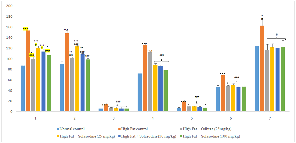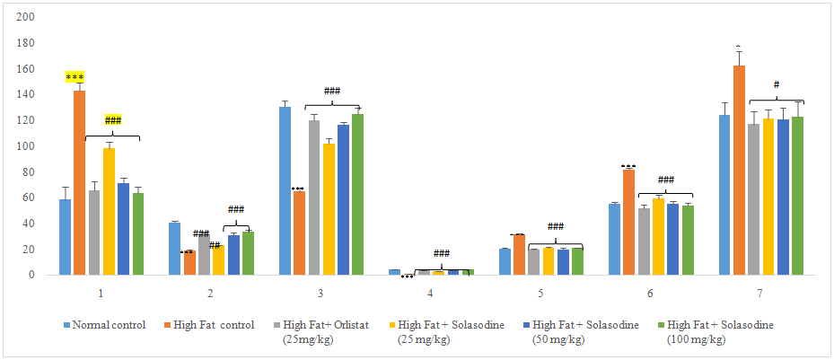 In contrast, further solasodine at 25, 50 and 100 mg/kg dose and orlistat significantly (p<0.05 and p<0.001) reduced total cholesterol level as compared to HF control group. Solasodine treated group also showed significant (p<0.001) increase in total cholesterol level as compared to normal control.