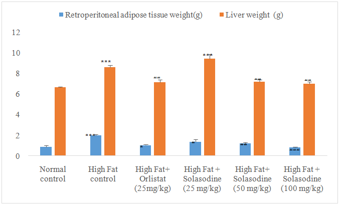 Fig. 5: Effect of solasodine on the retroperitoneal adipose tissue weight and liver weight in rats fed on high-fat (HF) diet