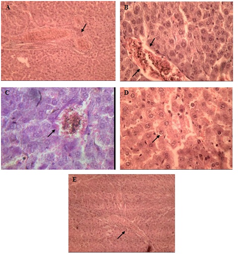 For histopathological studies, a small portion of the liver tissue from all groups of animals was excised immediately after sacrifice. Liver tissues were fixed in 10 % formalin for 24 h at room temperature. Liver tissues were embedded in paraffin and sections were cut 3-5 µm slides and were stained with haematoxylin and eosin. Liver tissues were observed under the microscope.