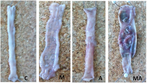 Macroscopic damage parameters of the colon after associated treatment methionine-acetic acid revealed severe ulceration, edema, and tissue necrosis (p˂0.001) and significant increase of ration colon weight/length (p˂0.05) and colon width (p˂0.01) in MA group (fig. 1, table 5).