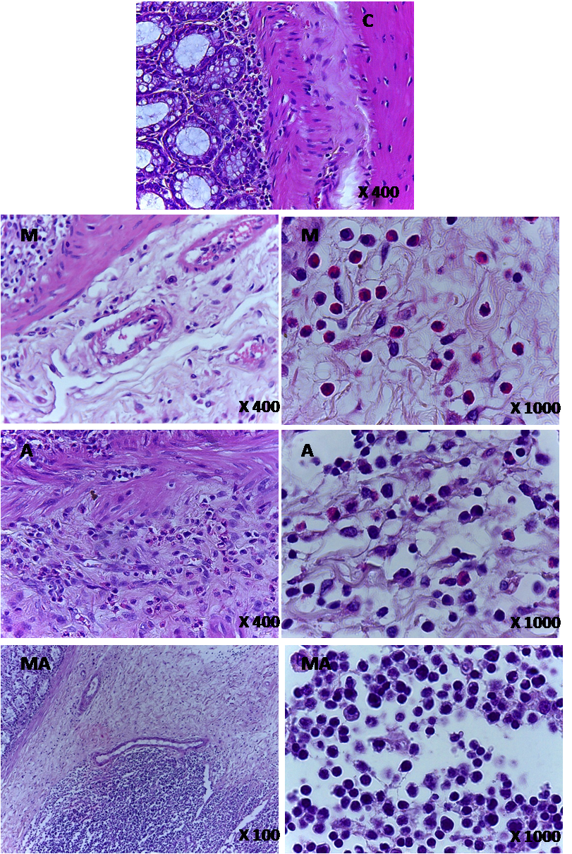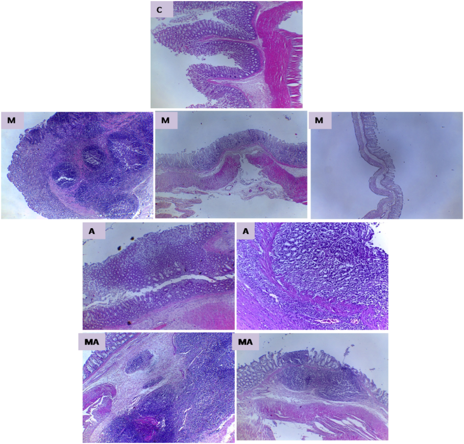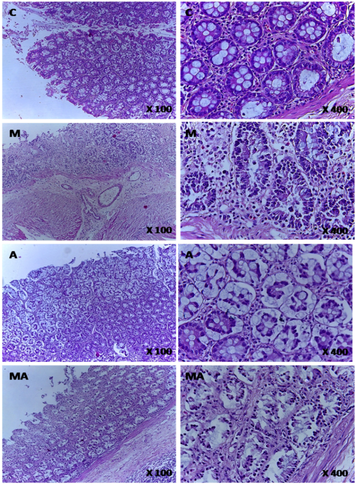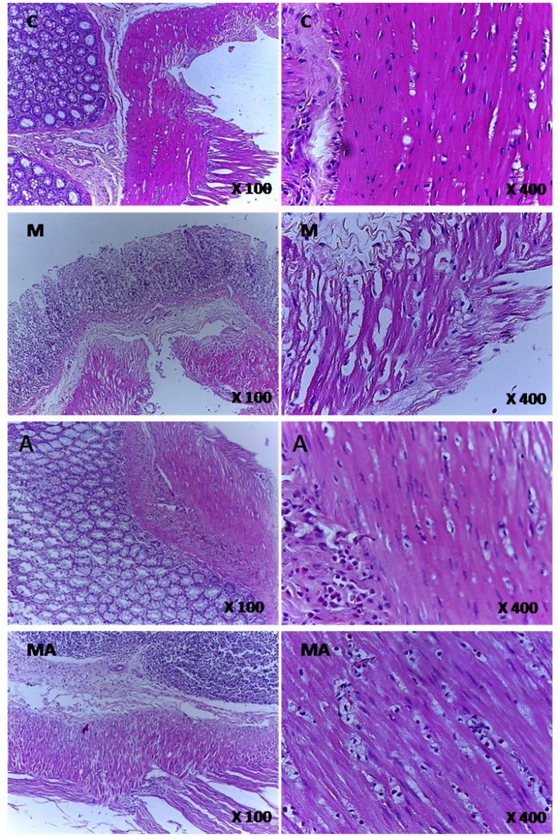 Fig. 2: Photographs of colon sections of rats stained with H and E (x40) showed effect of high methionine diet and/or acetic acid on colonic wall, C: control; M: methionine; a: acetic acid; MA: methionine+acetic acid