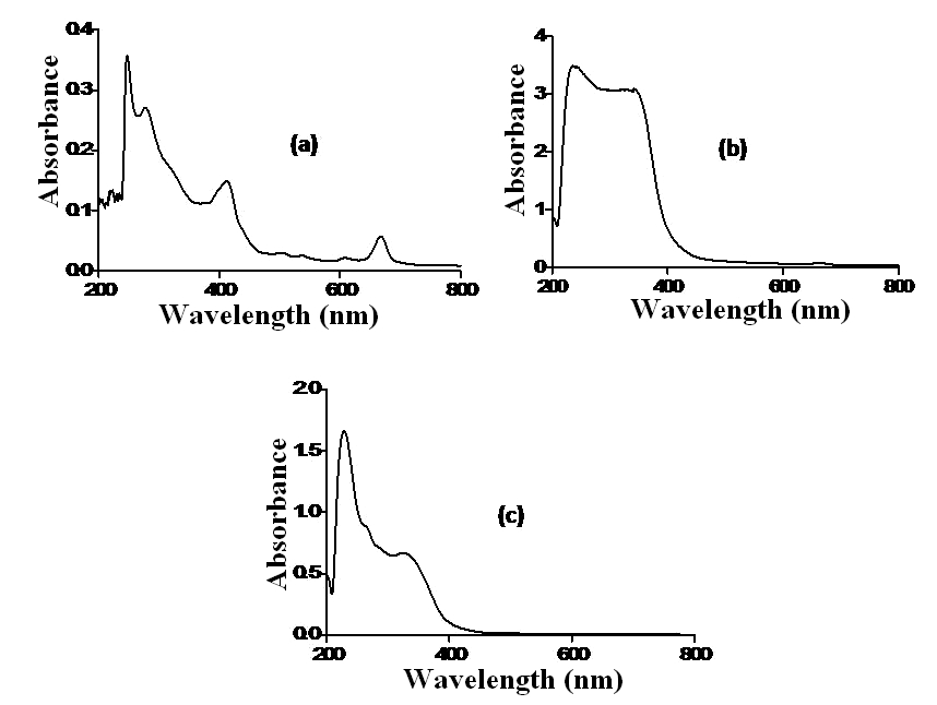 Fig. 1: UV-VIS spectrum of S. suaveolens. (a) Chloroform extract of S. suaveolens flowers; (b) chloroform extract of S. suaveolens flowers; (c) Methanolic extract of S. suaveolens leaves