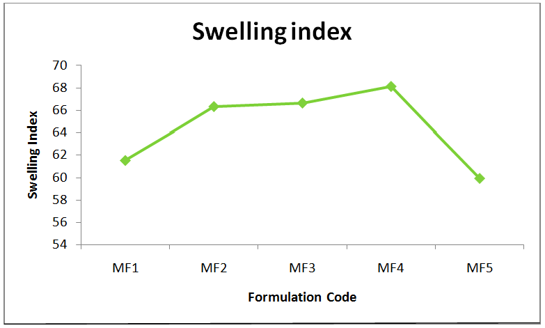 From swelling studies, it is clear that the formulation MF5 has minimum swelling index. Thus it can be concluded that the plasticizer[13] is very important constituent of the formulations prepared. The drug release from the unplasticized inserts, formulation MF5 was lower as compared to all other formulations. The plasticizer enhances the hydrophobicity of the polymer matrix resulting in enhanced swelling and consequent increase in the porosity of the matrix, thus leading to higher drug release.