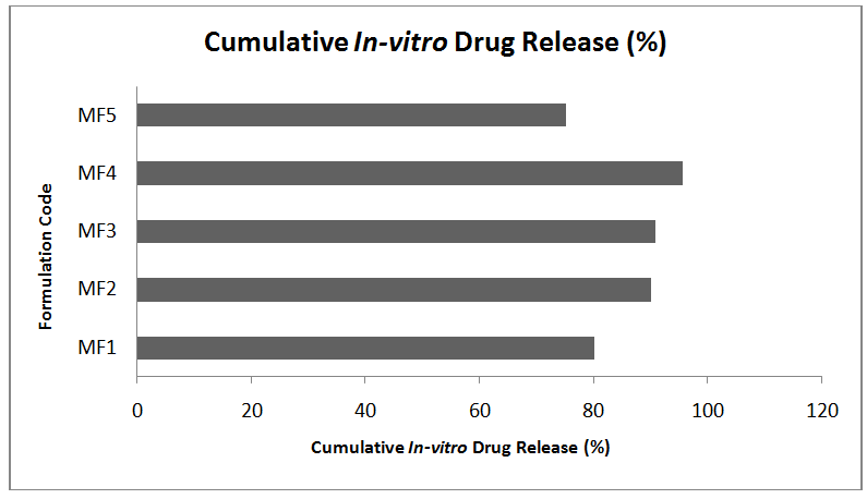 Drug release studies were carried out in STF using Franz diffusion Cell. Maximum cumulative drug release was obtained for MF4 with the release value 95.64 + 0.0009 and minimum cumulative drug release were obtained for MF5 with the release value 75.23 + 0.0023.