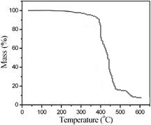 The thermal decomposition of resin is commonly determined by 951 thermo gravimetric analyzer. The resin sample was powdered to the same average mesh size and dried carefully in a vacuum desiccator. The boat was packed uniformly for analysis. For the dynamic measurement, the system was heated at a constant heating rate of 20°Cmin−1under a static atmosphere till the complete decomposition. The THQSA resin was found to be stable up to 405°C, after which degradation was found to be rapid. The TGA curve of THQSA resin is shown in figure 2