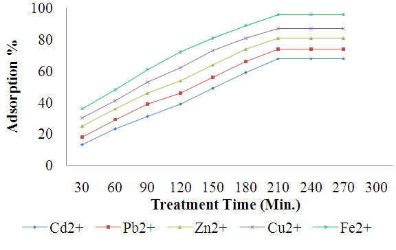 Adsorption of metal ions increases with increasing contact time. Figure 3 reveal that adsorption of metal ions on THQSA resin increases by increasing the treatment time from 30 to 210 min; optimum contact time for THQSA adsorbent was found to be 210 min. Other parameters such as pH of solution and agitation speed were kept optimum, while temperature was kept at 25°C.