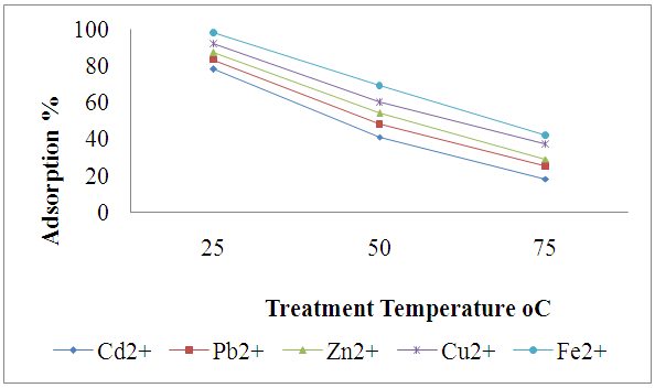 Fig. 4: It shows effect of changing treatment temperatures on the adsorption % of different metal ions onto THQSA resin