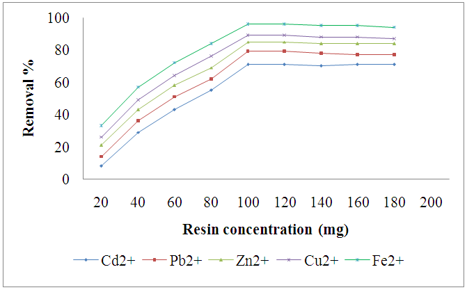 Fig. 5: It shows effect of THQSA resin quantity on removal of metal ions