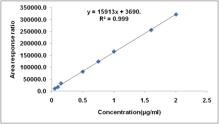The linearity of the method was determined by using a 1/x2 weighted least square regression analysis of standard plots associated with eight-point standard curve [13]. All the 3 calibration curves analysed were found to be linear for the standard concentration ranging from 0.05-2.0 µg/ml