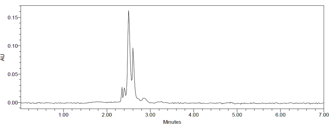 HPLC-PDA analysis of the blank human plasma samples showed no interference with both sofosbuvir and atazanavir (IS). The blank chromatogram is shown in fig. 4, indicating no interference in the sample at the retention time of 4.7 min for the drug sofosbuvir and at the retention time of 4.2 min for the IS. Sensitivity results were summarized in table 2. In the plasma, the limit of quantification was found to be 0.05 µg/ml with accuracy and precision.
