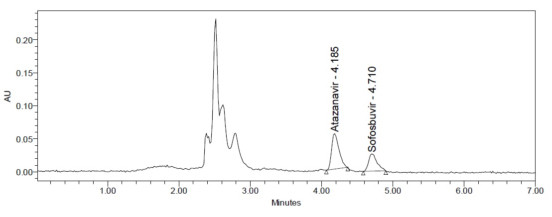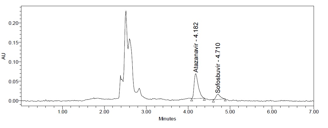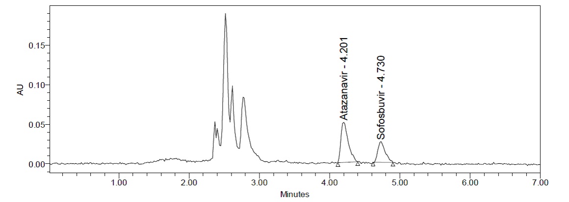 The drugs sample of sofosbuvir, atazanavir obtained from Clearsynth Labs Limited (Mumbai, India). Acetonitrile, orthophosphoric acid (OPA) HPLC grade (Merck Ltd, Mumbai, India), HPLC grade water (Fisher Scientific, India), is used in the study. Pooled drug-free expired frozen human plasma (K2-EDTA as anticoagulant) was obtained from the St. Theresa Blood Bank, Hyderabad, was used during validation and study sample analysis. The plasma stored into-70 °C±5 °C.