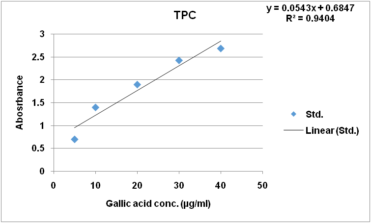 The total phenolic content was reported as Gallic acid equivalents (fig. 1) with reference to a standard curve (standard curve equation: y = 0.0543x+0.06847, R²= 0.9404). The total phenolic content measured in methanolic extract was 23.0±0.06 mg GAE/g of dry sample.