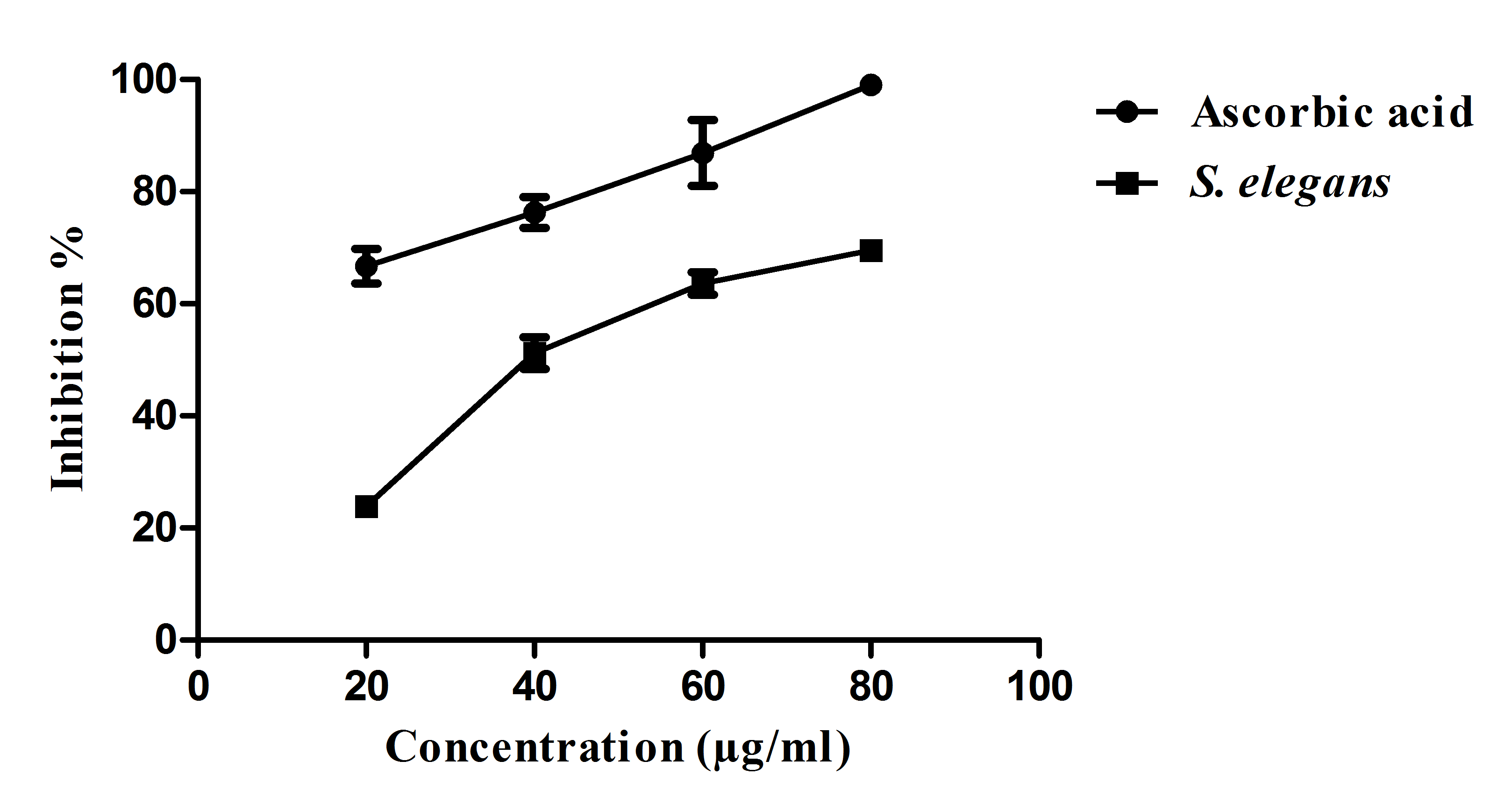 Fig. 2: Antioxidant activity of standard ascorbic acid and methanolic extract of S. elegans. The experiment was done twice (in triplicate) using two different samples