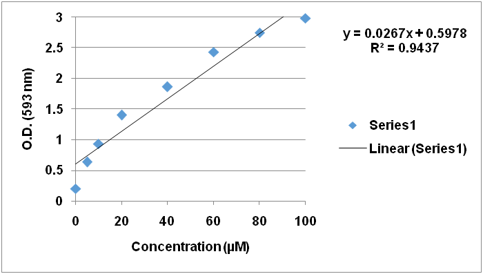 FRAP assay was carried out, and results were compared with a standard curve of ferrous sulphate (y = 0.0267x+0.5978, R² = 0.9437) (fig. 3). The antioxidant activity of methanolic extract of S. elegans (20-80 μg/ml) as determined by FRAP assay varied from 33.33-58.76 μM TE/g. The methanolic extract of S. elegans revealed significant reducing potential (IC50 51.62±0.023 μg/ml) which increased with the increase in concentration from 20-80 μg/ml (table 2, fig. 4).