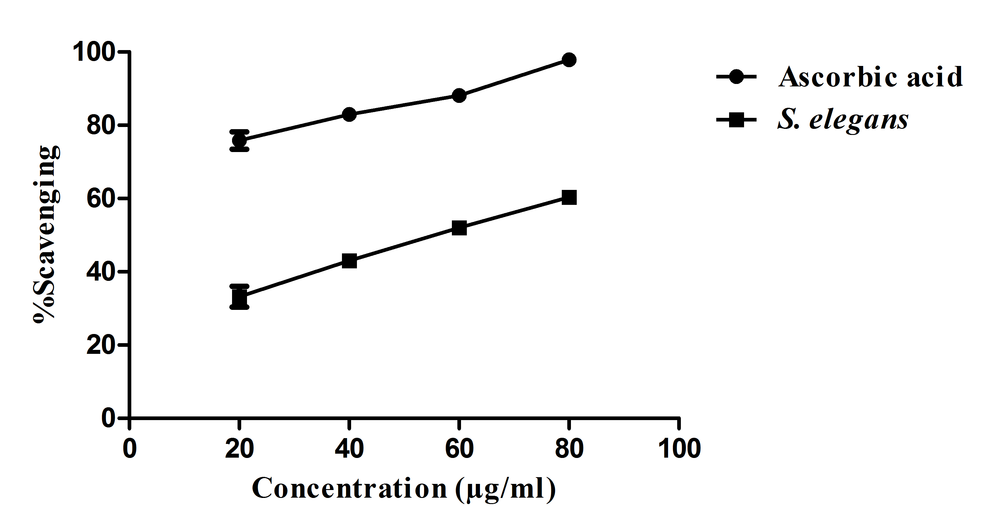In vitro ABTS assay was conducted to study the antioxidant activity of S. elegans at a concentration range of 20-80 μg/ml. Ascorbic acid, a well-known antioxidant compound was taken as positive control (fig. 2). As compared to ascorbic acid (IC50 12.56±0.1 μg/ml), S. elegans extract also showed significant antioxidant activity with an increase in concentration (IC50 41.66±0.015 μg/ml) (table 2, fig. 2). Thus the selected plant possesses high antioxidant potential.