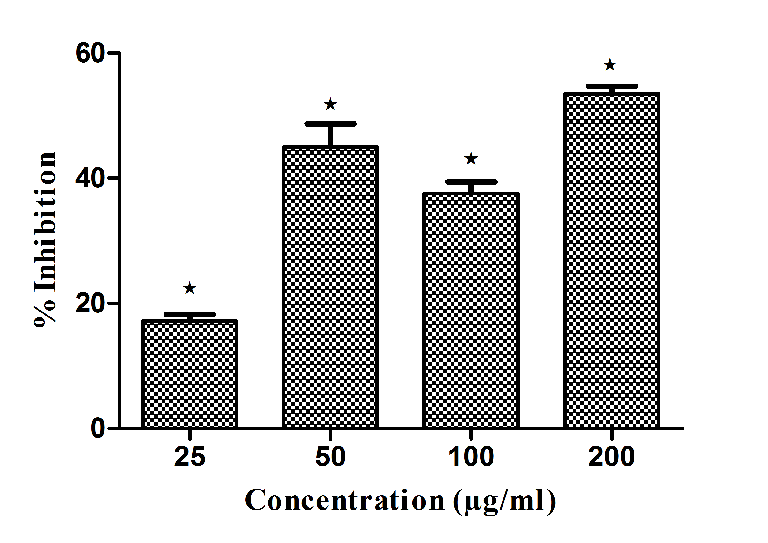 In vitro cytotoxicity was analysed on MCF-7 cells by MTT assay at four different drug concentrations (25, 50, 100, 200 μg/ml). S. elegans showed significant cytotoxicity from 50 μg/ml to 200 μg/ml, and IC50 value was calculated as 158.7±0.13 μg/ml (fig. 5). The highest activity was recorded at 200 μg/ml, i.e. 54%.