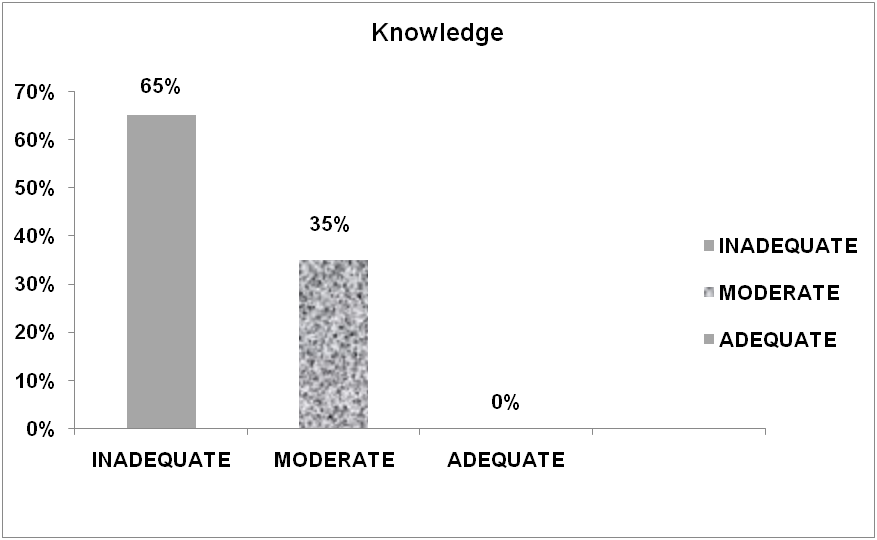 Out of 60 people 39(65%) had inadequate knowledge, 21(35%) had moderately adequate knowledge, and none had adequate knowledge. The mean and standard deviation of the study were 7 and 2.76.