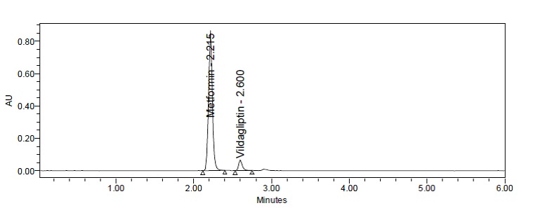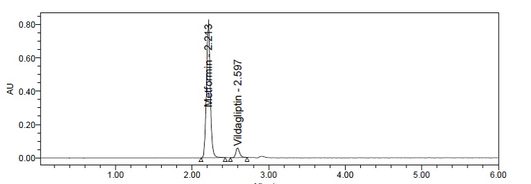Tablet powder equivalent to 50 mg of vildagliptin and 500 mg of metformin were weighed and transferred into a 100 ml volumetric flask, 30 ml of diluent was added and sonicated for 15 min and the volume was made up to the mark with diluent. From this solution further dilution was made to get the final concentration of 12.5 µg/ml of vildagliptin and 125 µg/ml of metformin, ten microliters of final solutions were injected into the HPLC system; chromatograms were recorded and from the peak areas of vildagliptin and metformin, the amount of drug present in sample was computed.