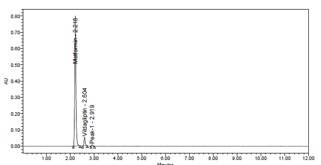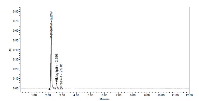 Conclusion: A new sensitive, simple and stability indicating reverse-phase high-performance liquid chromatography [RP-HPLC] method has been developed and validated for the determination of vildagliptin and metformin. The proposed method can be used for routine determination of vildagliptin and metformin.