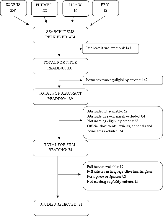 The Eric, Lilacs, Medline/Pubmed and Scopus databases were used. The search was conducted in June 2015.