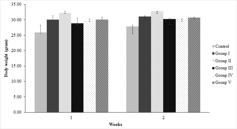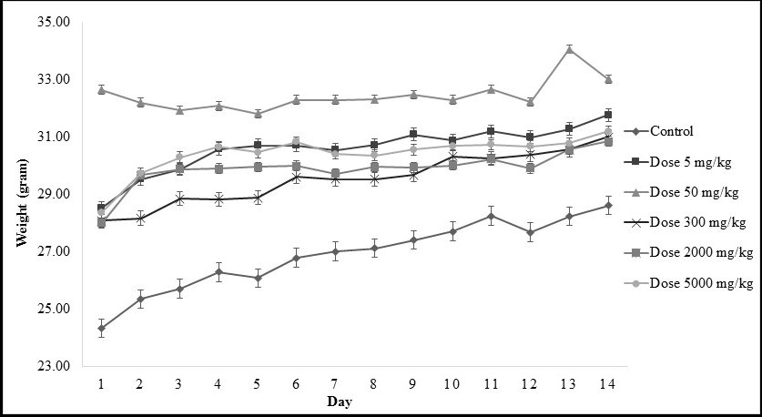 There were no signs of mortality in all groups of rats. In general, the rats gained weight as seen in fig. 1. The average weight gains for all groups were within the normal range. There was no any significant difference in average weight gains for all treatment groups (fig. 1). It showed that all treatment groups had similar weight gains. However, a significant difference (𝑃<0.05) was seen when the extract given at a dose of 50 mg/kg (P=0.006). The average body weight on all groups could be seen in table 1.