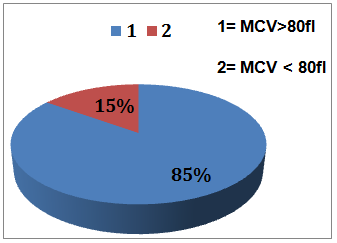 The prevalence of β-thalassemia trait was found to be 5.125% in this population (fig. 5). Thirty-four percent of the population is affected with β-thalassemia trait whose MCV value is less than 80fl (fig. 6).