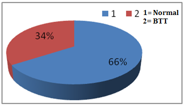BTT and non β thalassemia cases whose MCV<80fl were checked for risk factors of complete hemogram. In BTT, 4 (out of 41) and Non BT 5 (out of 79) totally 9 samples (out of 120) have shown WBC ˃11000 x103/µl; 20 samples of BTT and 27 samples of Non BT and a total of 47 have RBC ˃5 x106/µl; Hb<10 g/dL was found in 14 samples in BTT and 18 samples in non BT, totally 32 samples; in HCT<35 %, seventeen samples have shown positive in BTT cases and 25 samples showed positive in Non BT cases, thus entirely 42 cases showed positive; 40 BTT and 77 non BT and overall 117 samples had MCH<26.5 pg; MCHC<31.8 g/dL was initiated in 37 BTT and 70 Non BTT and a total of 107 samples (table 4). Discriminant functions in the population which have MCV<80fl was checked. Eight BTT and 17 Non BT, totally 25 subjects showed positive for DF1; positive for DF2 was present in 13 BTT and 24 Non BT subjects, totally 37; DF3<3.8 was seen in 11 cases in BTT and 5 cases in Non BT, a sum of 16 cases; 40 samples of BTT and 72 samples of Non BT, entirely 112 samples have DF4<1530; 37 samples of BTT and 70 samples of Non BT, a sum of 107 have DF5 ˃5 x106/µl (table 5).