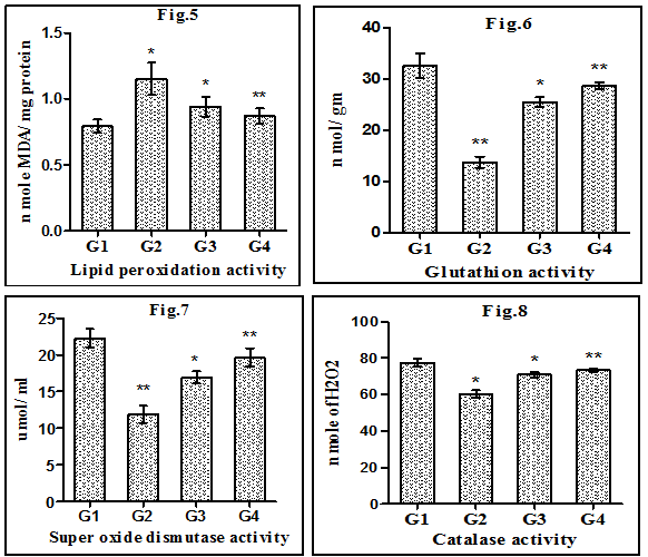 Fig. 5, 6, 7, 8: Shows the level of LPO (MDA concentration), Glutathione, superoxide dismutase and catalase activity in testes. There is statistical significance: * = significant (P≤0.05), ** = highly significant (P≤0.01) in the group of dichlorvos exposure treated with Zingiber officinale (G3 and G4) as compare to dichlorvos exposure only group (G2)