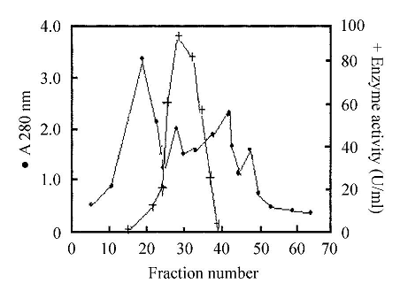 The protein obtained from dialysis was loaded onto a column of Sephadex G-100 (2× 40 cm) equilibrated with acetate buffer, pH 5. The elution profile of gel filtration chromatography is shown in Figure 1