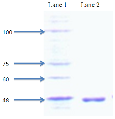Fig. 2: SDS-PAGE showing the purified lipase, Lane 1: Bio-Rad high range protein marker , Lane 2: Purified lipase (46kda)SDS-PAGE of Purified Lipase from Saccharomyces cervisiae