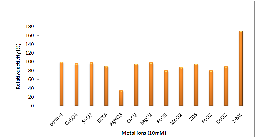 Metal ions are responsible for the maintenance of the stability of lipases [21]. Thus to find out whether the different metal ions stabilize or destabilize the enzyme, the effect of different metal ions and a metal chelator EDTA at 10 mM concentration on lipase activity was investigated and results are summarized in fig 5. In the present study control sample which did not contain any additives was used and it is assumed as hundred percent while calculating relative enzyme activities. As shown in fig 5, the lipase activity was strongly inhibited by Ag+ and completely inhibited by Hg+. Most of metal ions had a negative effect on the lipase activity. Generally, lipases are not sulfhydryl proteins; and thus in most lipases neither free –SH nor S–S bridges are important for their catalytic activity. This is substantiated by the use of 2-mercaptoethanol, p-chloromercuric benzoate and iodoacetate, which have no detectable effect on lipase from C.viscosum [22]. But in the present study the increase in activity with 2-mercaptoethanol indicated the presence of sulfhydryl groups on the active site of the enzyme. Similar inhibition and 2-mercaptoethanol enhancement was reported by Ueno et al. [23]. However not much decrease in the lipase activity was observed in the presence of all the metal ions incubated. Except for Ag+ above 80% of the activity was retained in all the metal ions. Lipases from thermophilic Rhizopusoryzae and Mucor sp. isolated from palm fruit showed very depressed activity in the presence of Hg2+with respect to our lipases [24, 25].