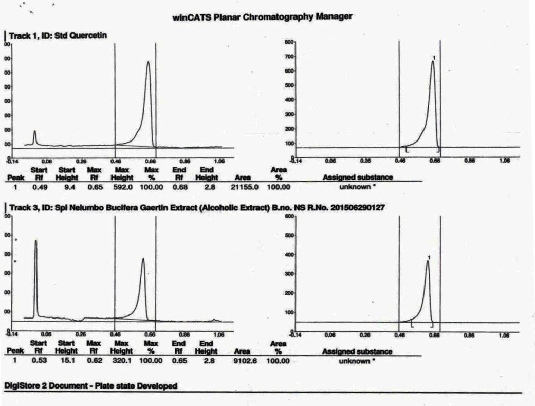 The ethanol seed extract of Nelumbo nucifera was chromatographed on silica gel 60 plates with a combination of toluene: ethyl acetate: formic acid (5:4:0.5, v/v/v) as the mobile phase. The peak purity of quercetin was assessed by comparing the spectra at peak start, peak apex and peak end positions on the spot [9].