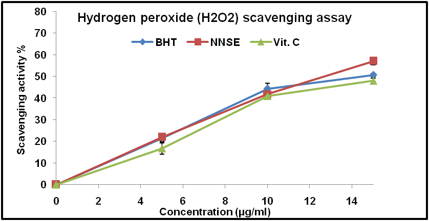 H2O2 probably reacts with Fe2+and Cu2+ions to form hydroxyl radical which causes toxic effects on different body cells [22-23]. So the accumulation of hydrogen peroxide in cells is very harmful. Hydrogen peroxide is highly important ROS, which is generated in vivo by several oxidase enzymes, because of its ability to prevent the biological membrane. There is increasing evidence that it may be toxic if converted to hydroxyl radical (OH·) which cause severe damage to the biological system [24]. So the removal of hydrogen peroxide is very essential for any antioxidant defence in the cell [25]. In the present study, the antioxidant activity of NNSE was much better than BHT and vitamin C.