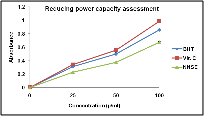 The presence of reductants in NNSE causes the reduction of the ferric ion into ferrous form which can be measured as blue colour compound at 700 nm. Fe3+is often used as an indicator of electron donating activity and which is an important mechanism of antioxidant action and can be strongly correlated with the other antioxidant properties [26]. The reducing properties of the plant extract are generally associated with the presence of reductones, which have been shown to exert antioxidant action by breaking the free radical chain [27]. The reductones are reported to react with certain precursors of peroxides, thus prevention of peroxide formation [28]. In this present study, NNSE showed significant antioxidant activity in reducing power assay. The reducing power capacity assessment of the seed extract was directly proportional to sample concentration and order of reductive potential was vitamin C>BHT>NNSE.