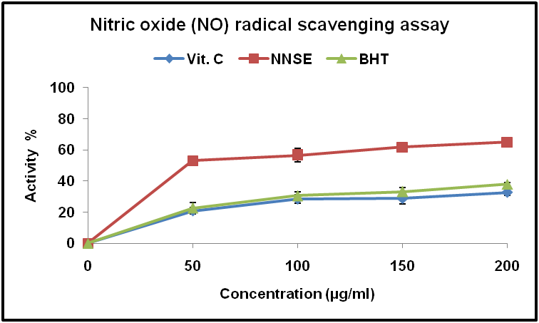 The ethanol extract of Nelumbo nucifera has potent NO scavenging activity. The percentage of scavenging NO at 200µg/ml of NNSE, BHT and vitamin C was found to be 64.84%, 37.84%, and 32.60% respectively. The NO scavenging effect of the NNSE, BHT and vitamin C was found to be as NNSE>BHT>vitamin C (fig. 5).