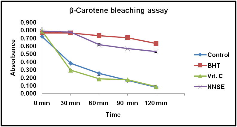 The linoleic acid-free radical attacks β-Carotene bleaching assay and hence it loses chromophore and orange colour. The antioxidant compounds in Nelumbo nucifera can decrease the extent of discolouration measured at 470 nm. The β-carotene principle is based on the loss of the orange colour of β-carotene due to its reaction with radicals, which are formed due to oxidation of linoleic acid in an emulsion. The rate of β-carotene bleaching can be decreased in the presence of antioxidants. This principle is used in the determination of antioxidant activity of NNSE in comparison with BHT and ascorbic acid [32].