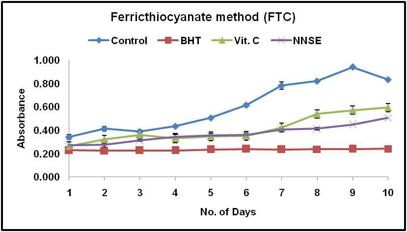 The FTC assay was used to determine the lipid peroxidation. The results showed that there was an increase in the absorbance of the control which reached at peak value in day 9. Thiobarbituric acid reactive substances (TBARS) are naturally equipped with biological ingredients like lipid hydroperoxides and aldehydes which increases in concentration against oxidative stress. TBARS assay values are usually mentioned as malonaldehyde equivalents. MDA formation takes place from the decomposition of polyunsaturated fatty acid due to the action of lipid peroxides. Low absorbance indicates the strong antioxidant ability. The results of the study indicate that ethanol seed extract of the plant possesses strong antioxidant activity. The TBA results were in agreement with those obtained by the FTC assay.