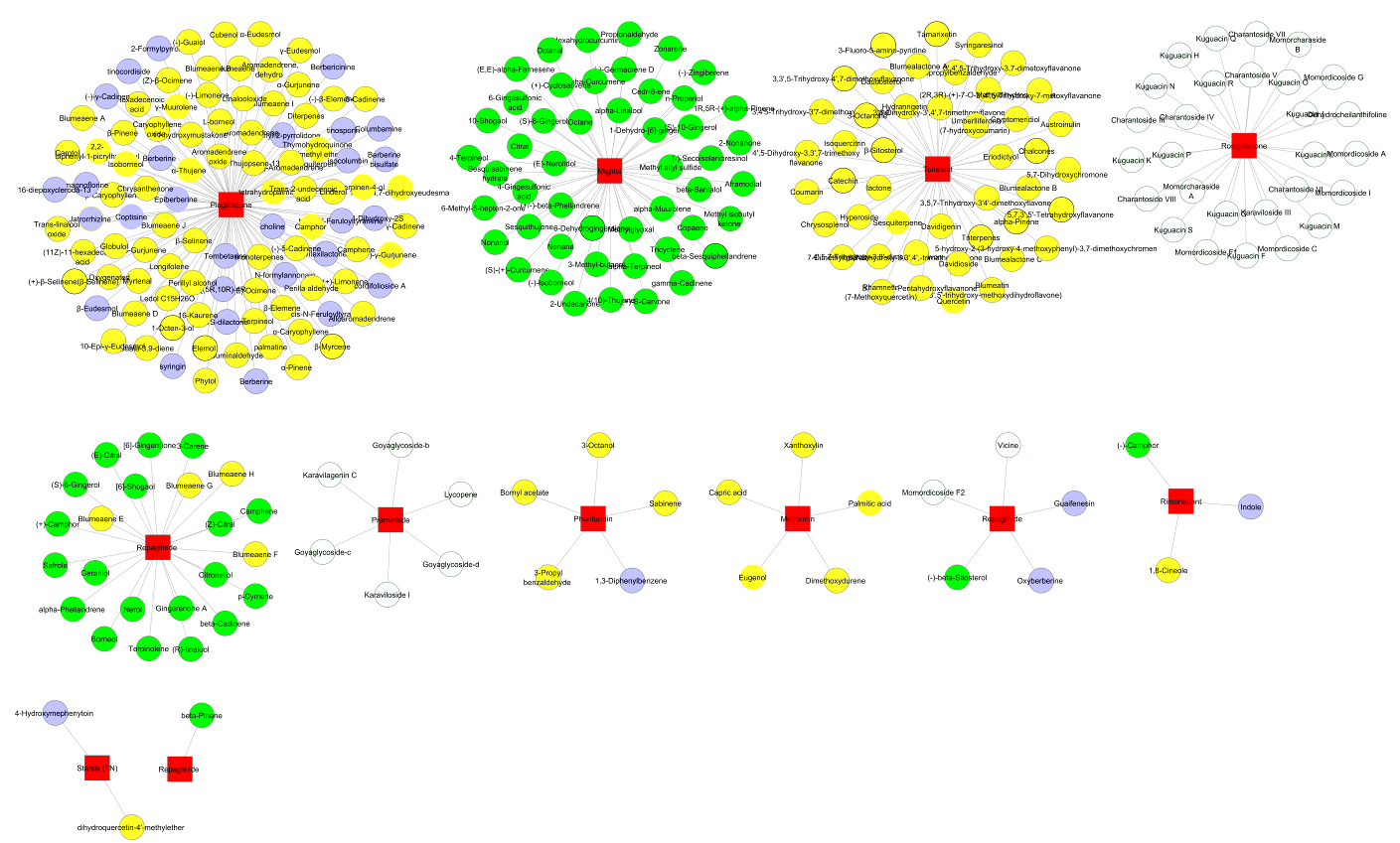 Fig. 1: The herbal ingredient-drug networks based on the target profile cluster analysis. Edges: the link between the herbal ingredients and FDA drugs; red square nodes: known FDA antidiabetic; the circle nodes herbal ingredients; green nodes: Zingiber officinale; blue nodes: Tinospora cordifolia; yellow nodes: Blumea balsamifera; barge node: Momordica charantia