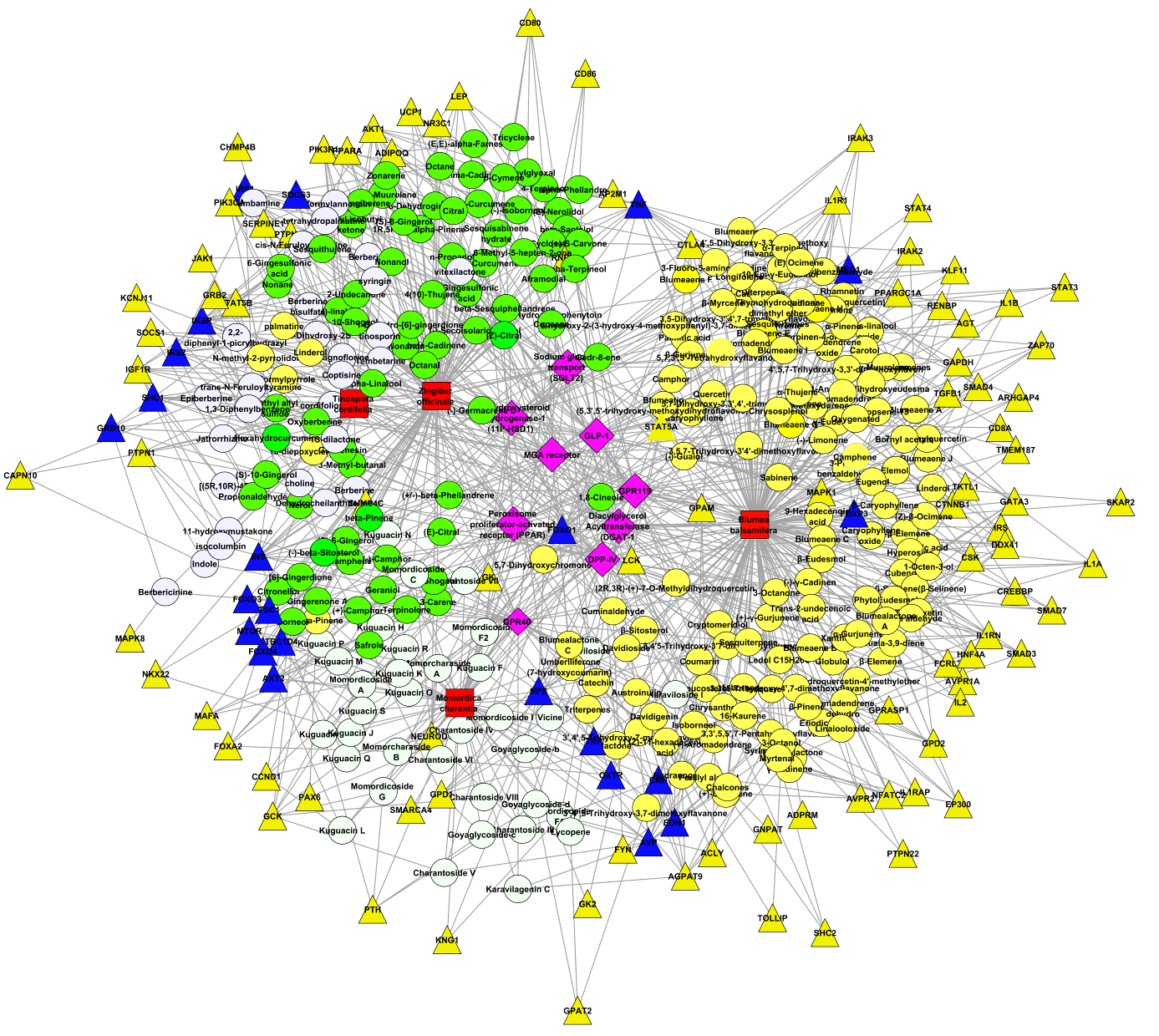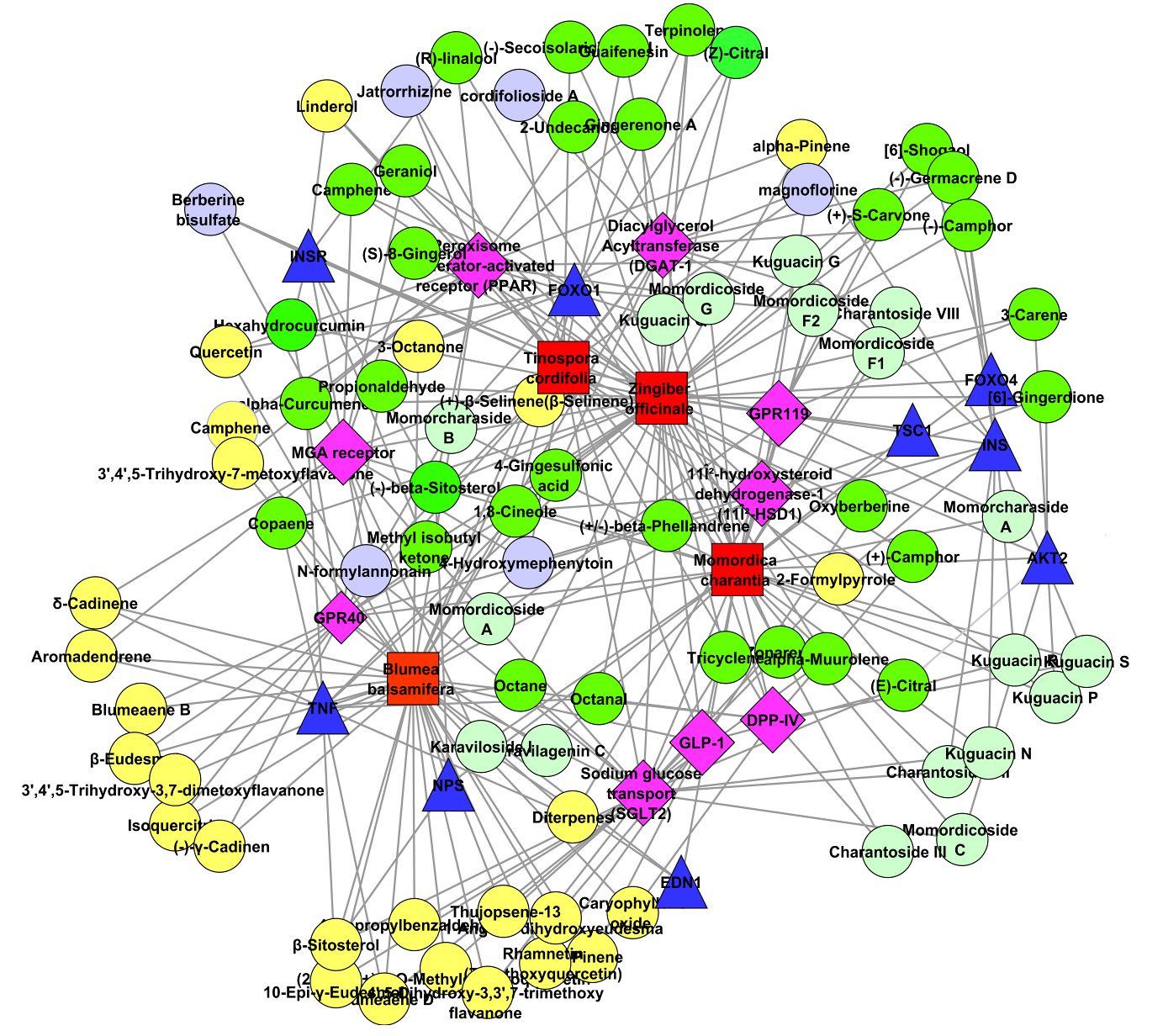 Fig. 2: Interaction network to understand the relationship among herbs, their ingredients and presumed targets visualized by Cytoscape. Edge; interaction between ingredients and their presumed targets; red rectangle node: Herbs, including Tinospora cordifolia, Zingiber officinale, Momordica charantia and Blumea balsamifera; circle nodes: Herbal ingredients; brown triangle nodes: Presumed targets for herbal ingredients; blue triangle: Presumed targets shared by the four herbs