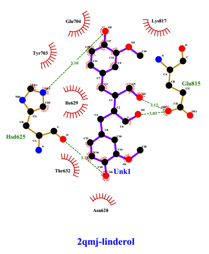 Linderol | Glu704,Tyr703, Lys817, Ile629, Thr632, Asn628 | Hsd625 Glu815 |