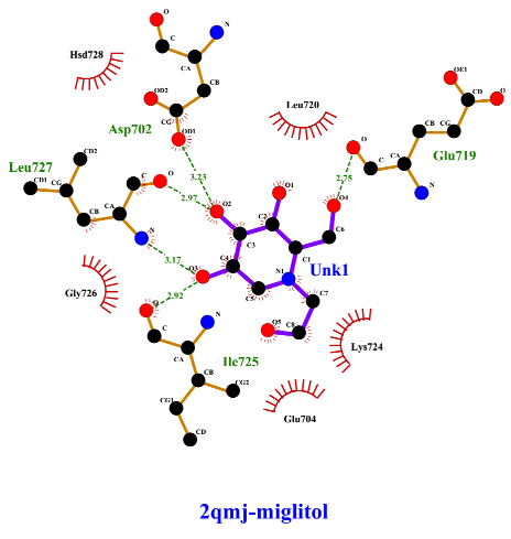 | Miglitol (control drug) | Hsd728,Gly726, Leu720,Glu704, Lys724 | Asp702 Leu727 Ile725 Glu719 |