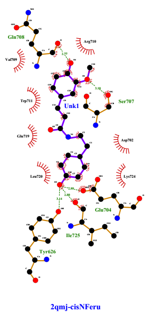cis-N-Feruloyltyramine | Val709,Trp711, Glu719, Leu720, Arg710,Asp702, Lys724 |